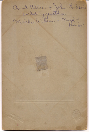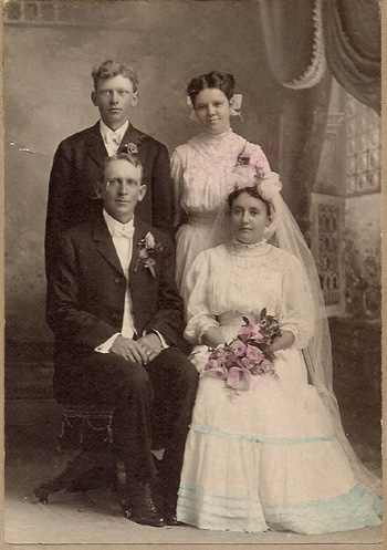 We also had this picture of the bride and groom, Alice Jepson, and John Gibson, with their attendants. Alice and John were married at the home of the bride on May 22, 1907. Only three were identified on the back of the photo. Edith was 15. The wedding took place at the home of the bride, the Jepson farm.